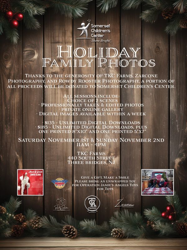 Thanks to the generosity of TKC Farms, Zarcone Photography, and Rowdy Rooster Photography, a portion of all proceeds will be donated to Somerset Children’s Center.